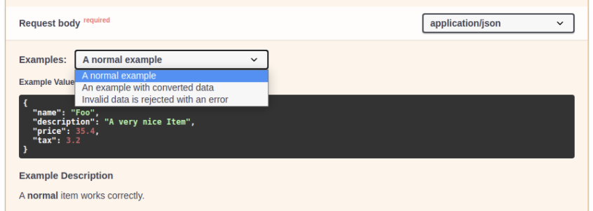 - 이것처럼 examples를 작성해놓으면, 아래처럼 example도 옵션처럼 선택해서 테스트할 수 있음